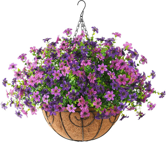 Artificial Flowers Hanging Baskets, Multicolor 12 Bundles Faux Flower Outdoor Hanging Basket Spring Summer Decoration, Fake Flowers Plants for Porch Patio Balcony Home Yard Decor (Purple)